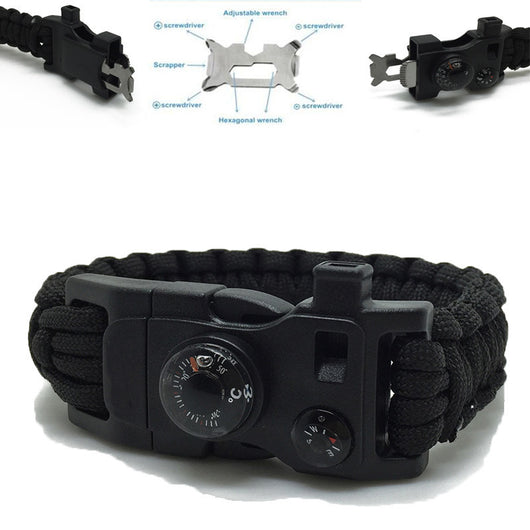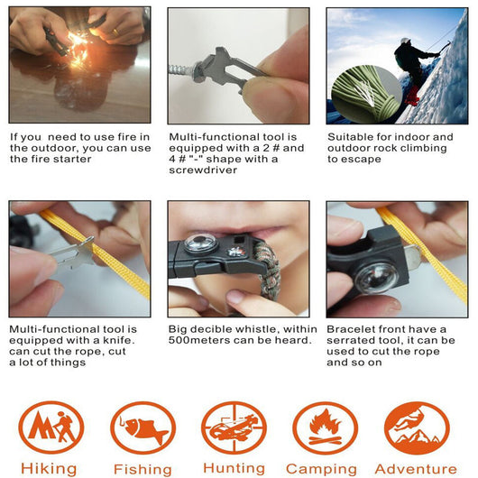 Fling Fire Starter, Whistle, Gear Buckle Camping Ignition Equipment, Rescue Rope Escape Bracelet Travel Kit, Cross & Straight Screwdriver, Scrapper, Monkey Spanner, Seckshant Schraubendreher, Compass, Themometer, Adjustable Wrench, Blade.